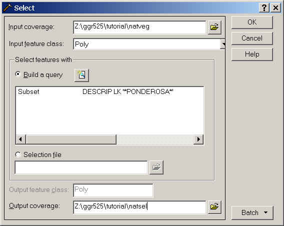 Criteria A ) Locate all areas which have either ponderosa pine vegetation or are owned by the National Forest Service. Coverages = (1) NATVEG = (2) LNDOWNER Items (values) = (1) DESCRIP ('*PONDEROSA*') = (2) LANDOWNER ('NFS') Criteria B ) Locate all areas that belong to the Forest Service and all areas containing ponderosa pine within this forest service land. Coverages = (1) NATVEG = (2) LNDOWNER Items (values) = (1) DESCRIP ("*PONDEROSA*") = (2) LANDOWNER ("NFS") Criteria C ) Locate all areas which have both ponderosa pine and belong to the forest service. Coverages = (1) NATVEG = (2) LNDOWNER Items (values) = (1) DESCRIP ("*PONDEROSA*") = (2) LANDOWNER ("NFS")